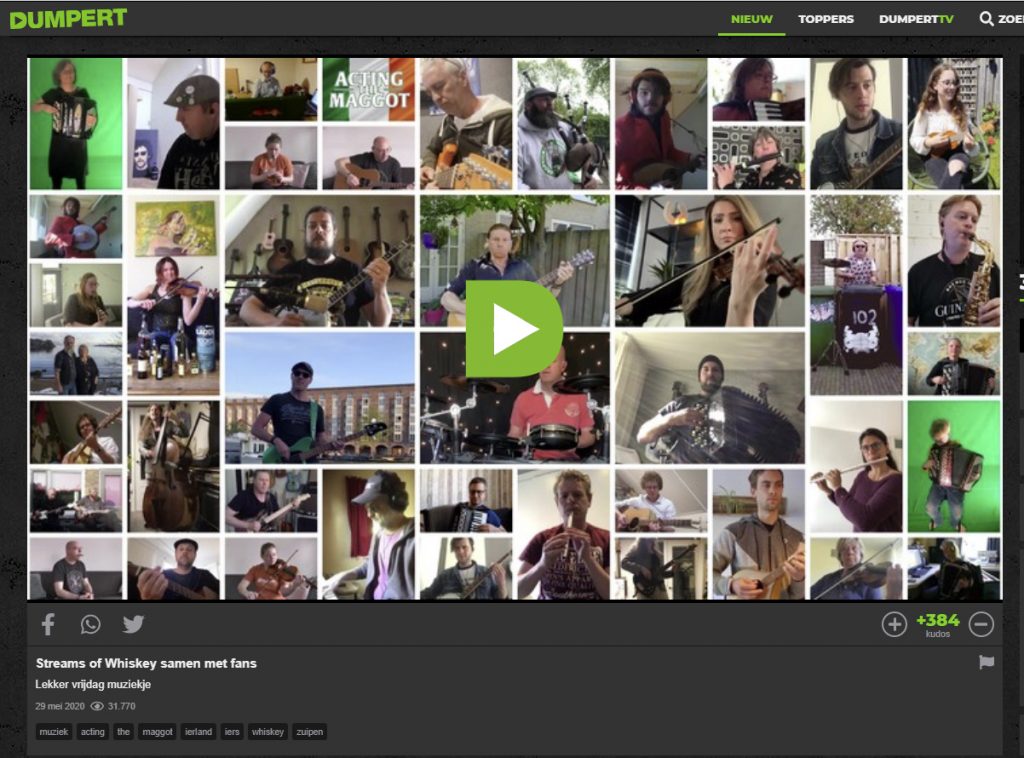 Geen optredens meer i.v.m. coronarestricties. Dan maar live streamen en om onze fans in de livestream te betrekken leek het ons geweldig samen met hen iets te doen. We vroegen ze om zo veel mogelijk filmpjes waarin ze Streams of Whiskey speelden. Dat hebben we geweten. Het bleek een heidens karwei om het bij elkaar te krijgen maar het is gelukt. Een lekker vrijdagmiddagfilmpje voor Dumpert. Geen ultieme kijkcijfers maar daar was het zeker ook niet om te doen. Het was gewoon een geweldig project samen.