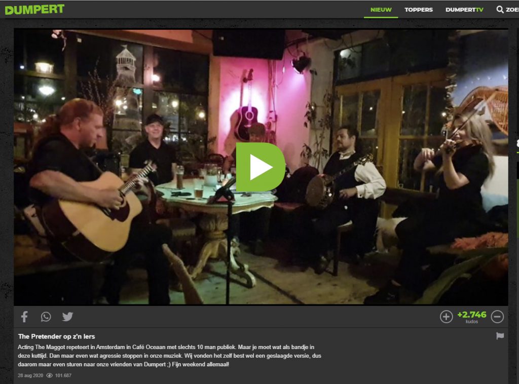 Het eerste optreden voor een heel klein publiek. Eigenlijk was het een openbare repetitie. Nog nooit eerder speelden we The Pretender van de Foo Fighters met onze band. Maar we vonden het altijd al een geweldig nummer. Aangezien we onze hele repetitie in Café De Oceaan in Amsterdam opgenomen hebben stond dit er ook op. We vonden het wel gaaf eigenlijk. En we scoorden er goed mee op Dumpert. Maar liefst 100.000 views in een dag en bijna 2800 like s(kudos). Qua score ons derde filmpje op Dumpert. Een kleine opleving in de coronatijd voor ons!